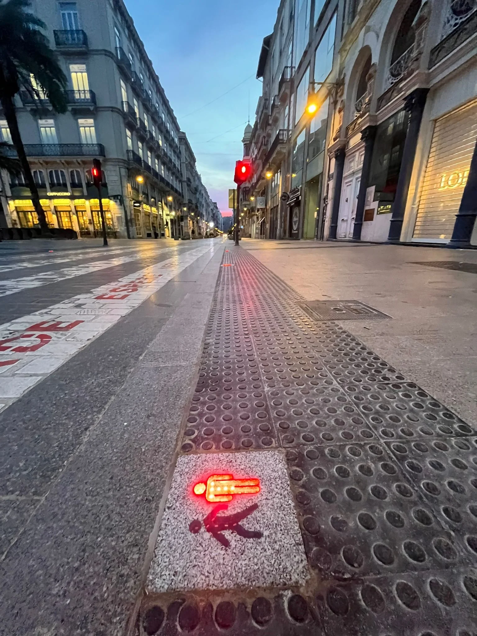 The device, installed on the ground aligned transversely to the pedestrian's path, aims to assist and supplement traffic signal information by synchronizing with the signals and being perceived in the background while walking while looking at their cell phones, both at night and in daylight thanks to the high brightness of the signal.